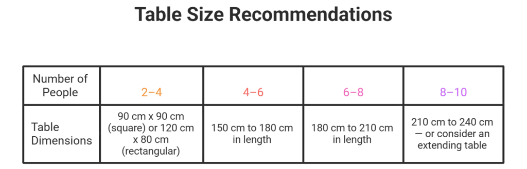 A dining table between 120 cm and 150 cm is ideal for smaller spaces.It sits well in the space without making the room feel crowded. Make sure to keep around 90 cm of clearance on all sides, and consider an extendable table if you need extra seating occasionally.