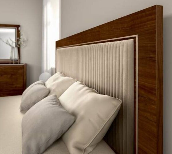 FIONA Walnut Upholstered Bed With Velvet Beige Headboard