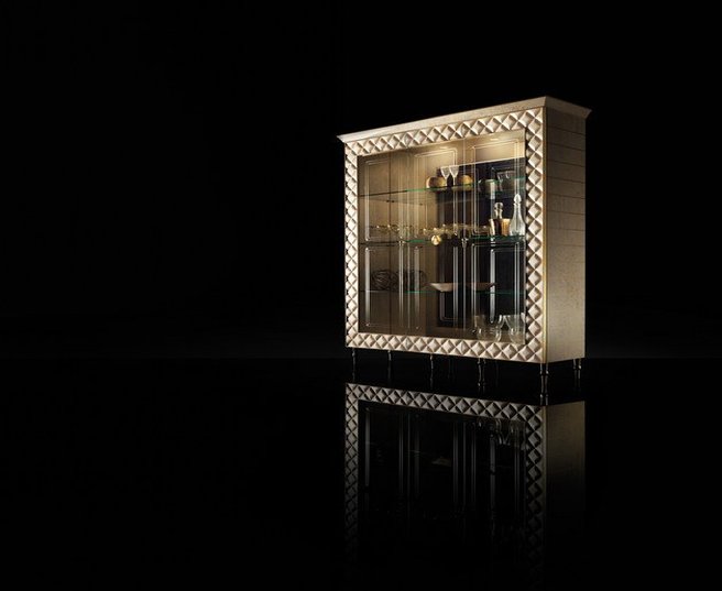 Display cabinets from the DFG ADELYN Glass Cabinet collection are items which can be used on their own, or combined with others to create a sequence that is both elegant and refined. They can also be combined with other items to invent new furnished spaces. A volume with minimalist geometry and available in various sizes, it is enriched by its delicate decorative details featuring lozenges on the outer frame and the brightness of its wide central glass surface. Its gilded feet raise the entire structure with such lightness that it will adapt to any architectural setting.
